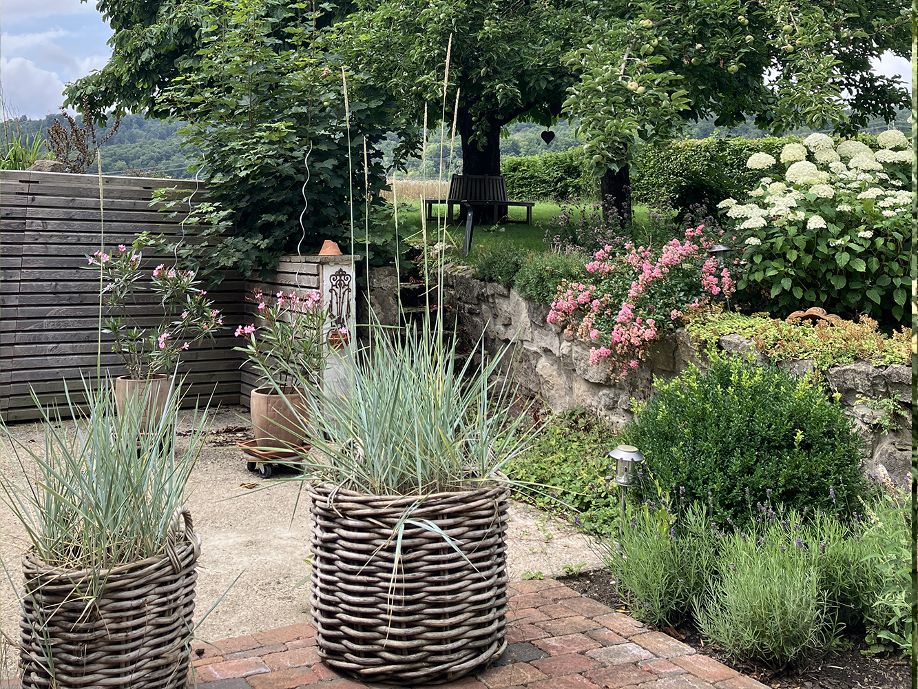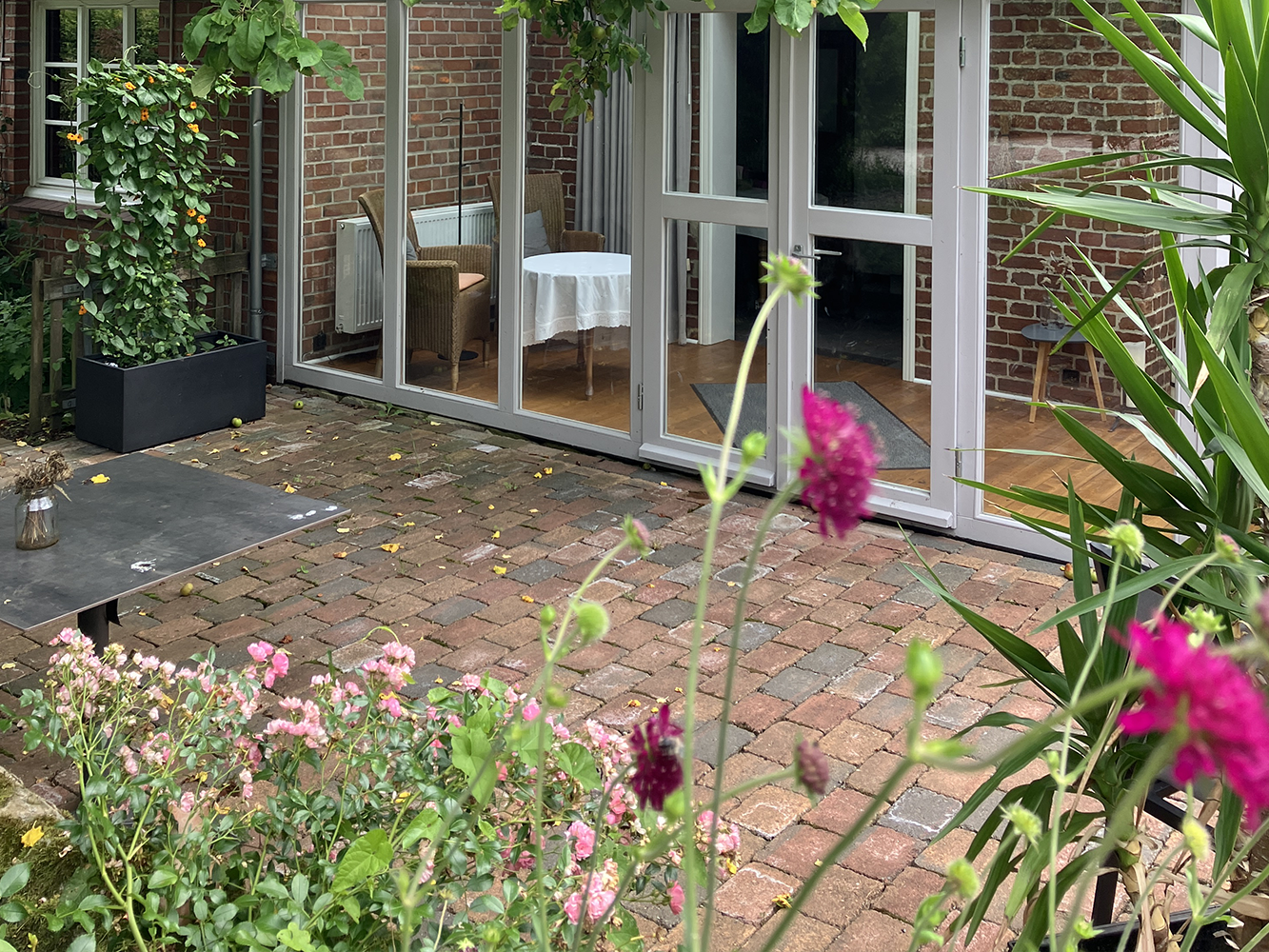 Die rund xx qm große Terrasse, eingefasst mit alten Natursteinen, hat direkten Zugang vom Wintergarten. Die Terrasse ist mit blühenden Pflanzen und Sträuchern umrahmt. Gräser, die sich im Wind wiegen, geben eine beruhigende Atmosphäre. Kurze Wege aus der Küche draußen machen den Aufenthalt zum Essen in der Natur perfekt.